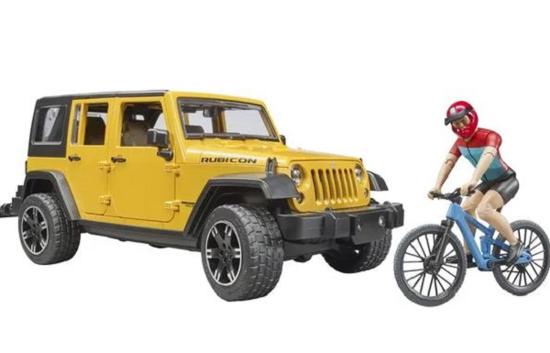Za doseganje najlepših gorsko kolesarskih poti je Jeep Wrangler Rubicon Unlimited pravi terenski talent. Poleg dvodelne odstranljive segmentne strehe je mogoče odpreti tudi pokrov motorja, prtljažna vrata in vsa štiri vrata. V kabinskem delu vozila je prostor za štiri BRUDER-jeve figure. Dodatni volanski drog se uporablja za enostavno krmiljenje skozi strešno loputo in se lahko shrani v dno vozila, ko ni v uporabi. Osi imata vzmetenje, kot je značilno za terenska vozila, pnevmatike s tekalno površino, ki so nameščena na kromirana platišča atraktivnega SUV videza. Gorsko kolo lahko priročno namestite na priloženi nosilec za kolesa, ki je pritrjen na kljuko prikolice.