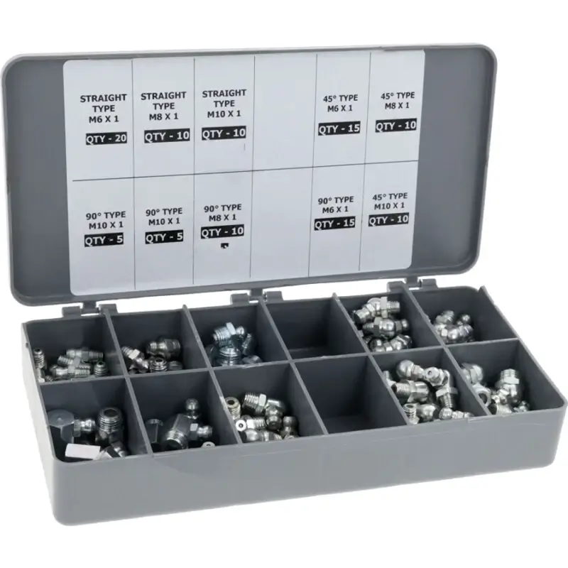 110- delni set vsebuje različne tipe in velikosti mazalnih čepov, ki omogočajo enostavno mazanje ležajev, gredi in drugih gibljivih delov.
