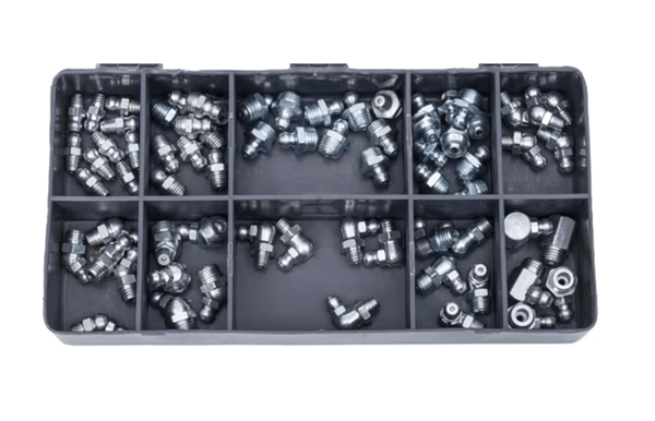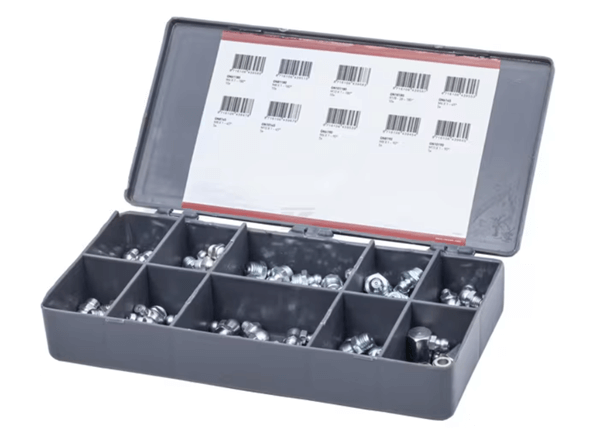 Set vsebuje različne velikosti in tipe čepov, primeren je za uporabo z večino ročnih in hidravličnih mazalnikov ter je nepogrešljiv pripomoček v delavnici, servisu ali pri vzdrževanju kmetijske mehanizacije.