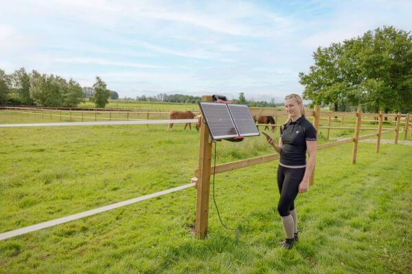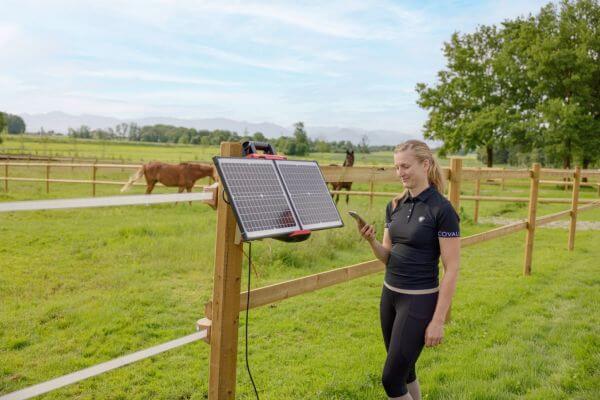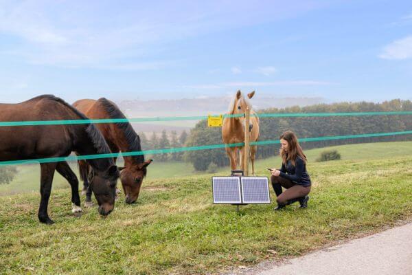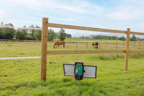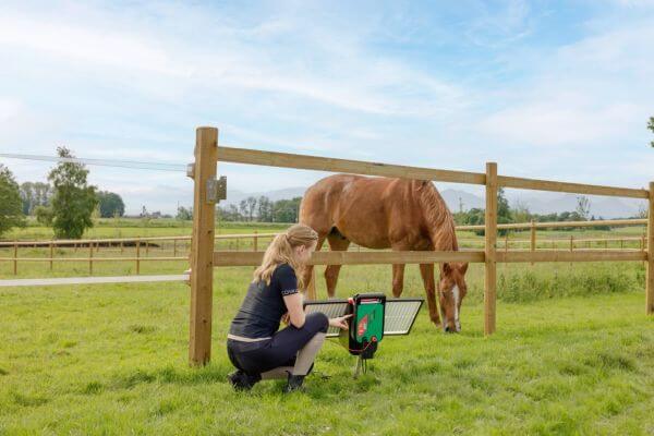 Napajanje in živali: naprava je 12 V solarna ograja, ki deluje na 12 V baterijo. Nemontiran 40 W solarni modul podpira baterijo. Idealno za konje, govedo, koze, ovce in volkove.
