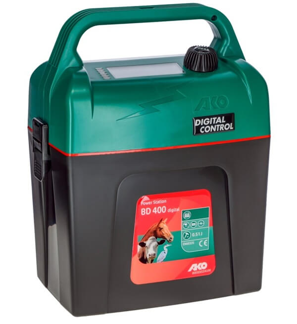 Power Station BD 400 digital je zmogljiva 9‑voltna baterijska naprava za električne ograje, primerna za srednje velike in srednje obraščene ograje. Idealna je za vse vrste živali, kot so konji, govedo, koze, psi in perutnina. Naprava omogoča digitalni prikaz napetosti ograje in akumulatorja ter LED stolpični prikaz za enostaven nadzor, tudi v temi. Samodejni način zagotavlja minimalno porabo baterije in optimalno moč ograje. Naprava je robustna, odporna na UV-sevanje, udarce in vremenske vplive ter vključuje zaščitno stikalo za žrebeta.