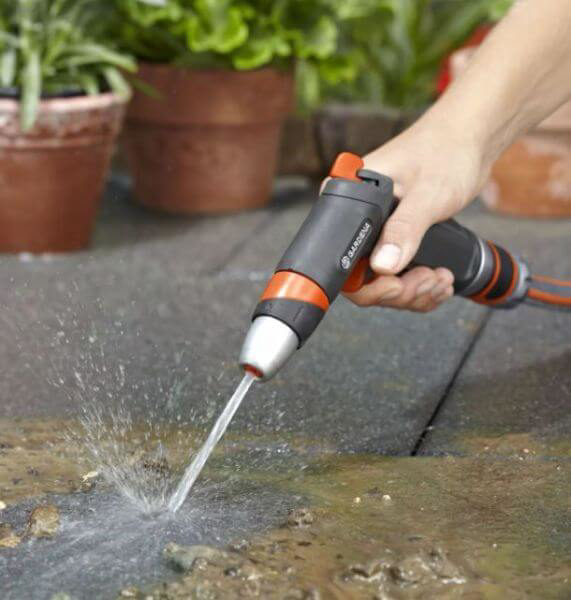 kovinski škropilnik zelo dobro prenese obremenitve. Zahvaljujoč elementom iz mehke plastike se brizgalnik udobno prilega roki, ne da bi zdrsnila. Vodni curek je mogoče neskončno nastaviti od polnega curka do pršenja megle. Škropilnik lahko nastavite na neprekinjeno delovanje za udobno neprekinjeno zalivanje. Ponuja močan curek vode za čiščenje in fin razpršilec vode za namakanje.
