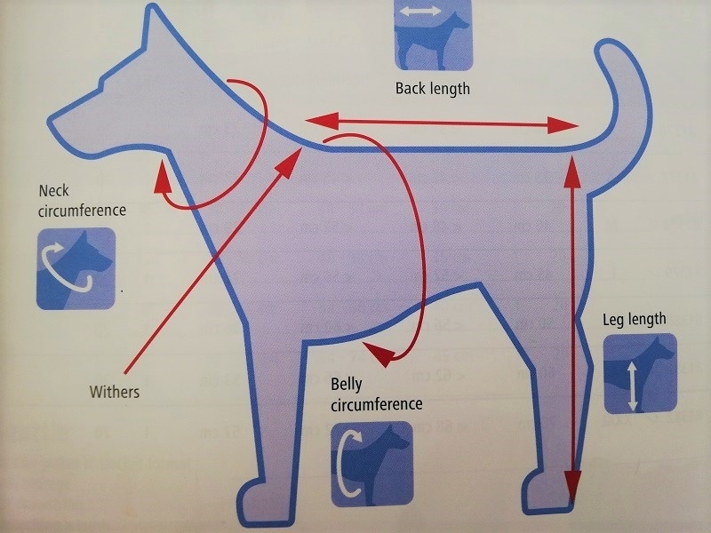 3. Obseg trebuha se meri na najširši točki trebuha, takoj za sprednjimi nogami. Obseg trebuha na oblačilu mora biti za 5-10 cm večji od obsega vašega psa, da se zagotovi ustrezna svoboda gibanja.