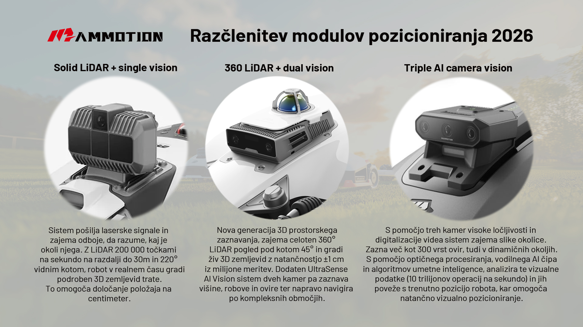Z uporabo 360° LiDAR-ja za navigacijo, vida za hitro prepoznavanje objektov ter NetRTK-ja za korekcije sistem zagotavlja natančnost do ±1 cm, inteligentno preklapljanje senzorjev in brezhibno navigacijo na vsakem travniku ali terenu.