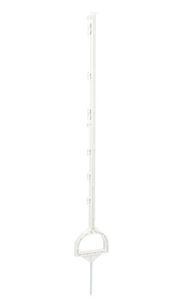 Stremenski steber 114,5 cm bel je plastični steber za ograje/pasove — ojačan s steklenimi vlakni — s pocinkanim talnim žebljem in “stremensko stopničko”, ki olajša zabijanje v tla.