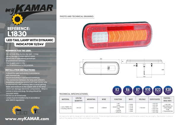 L1830 je certificiran izdelek v skladu s standardi ECE R3, ECE R6, ECE R7, ECE R10, ECE R23 in ECE R38.