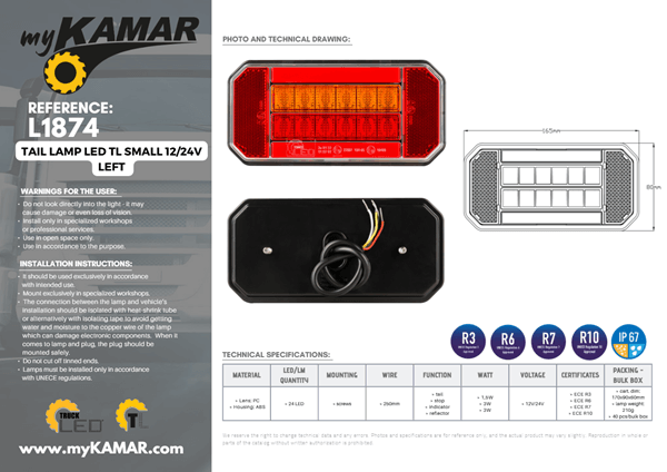 L1874 je certificiran izdelek v skladu s standardi ECE R3, ECE R6, ECE R7 in ECE R10.