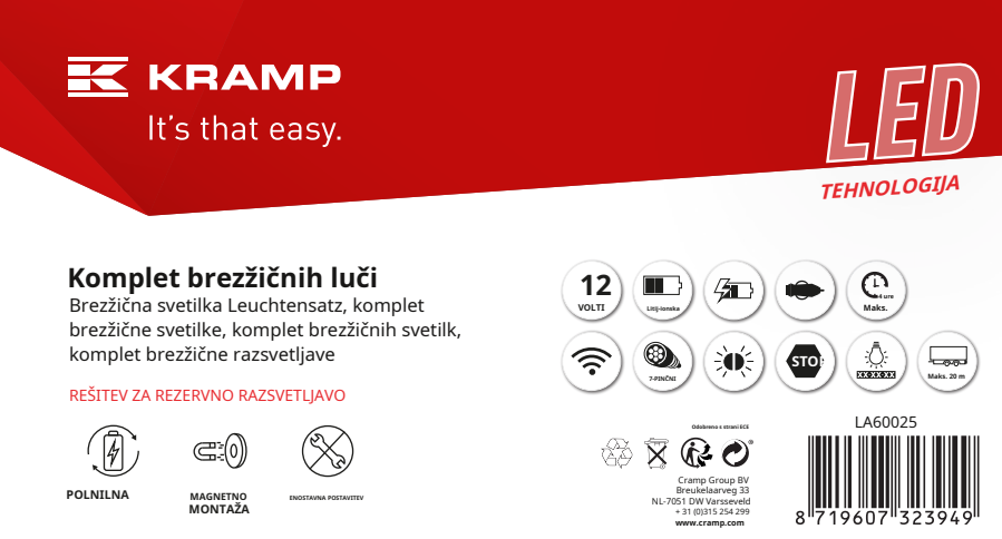 je vrhunski komplet, ki ga z lahkoto namestite na prikolico. Komplet vključuje zavorno, pozicijsko in luč za registrsko tablico. Z njim boste vedno pravilno označeni na cesti.